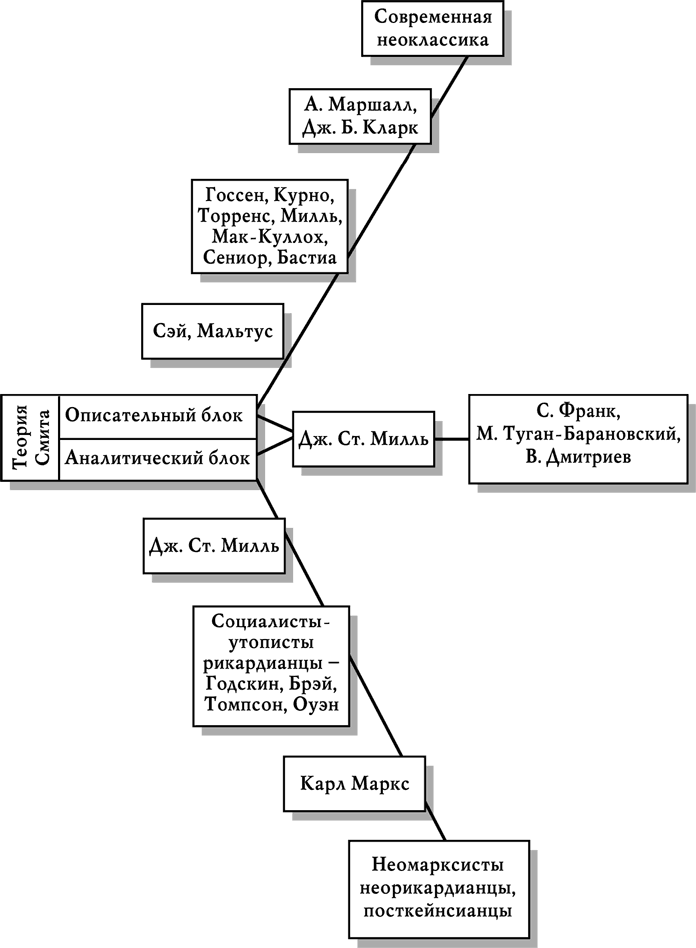 Понимание истоков двойственности экономической теории Смита существенно важно не только для выявления ее особенностей, но и для раскрытия всего процесса эволюции экономической мысли после Смита. Последующее развитие политической экономии (в некоторых аспектах – вплоть до наших дней) во многом сводилось сначала к систематизации и разработке идей, входящих в эти два противоречащих друг другу различных теоретических блока учения Смита, в полемике между сторонниками этих блоков, а затем в постепенном обособлении данных блоков друг от друга, а со временем и в противопоставлении их друг другу в качестве самостоятельных течений политической экономии, нередко ведущих между собой ожесточенную теоретическую и идеологическую борьбу (рис. 2).