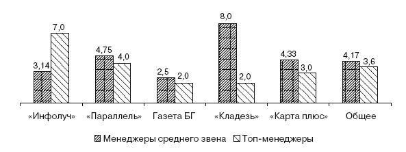 У менеджеров среднего звена число подчиненных составляет «на круг» 4,16, у топ-менеджеров – 3,6. Однако данные цифры получены на основе простого деления численности респондентов, у которых в подчинении никого нет (специалистов), на число менеджеров среднего звена (т. е. людей, у которых есть или декларируется в подчинении некто) и численности менеджеров среднего звена на число топ-менеджеров (рис. 2.6).
