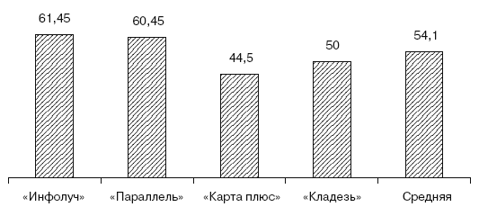 По утверждению сотрудников, в большинстве компаний очень высокая нагрузка, приходящаяся на одного сотрудника (исходя из количества эфира). В этом смысле наилучшая ситуация в Барске (ТРК «Параллель»), а наихудшая, по оценкам сотрудников, в Стачарах (ТРК «Кладезь»). Расчет количества программного контента, приходящегося на одного сотрудника, велся по особой процедуре. Не учитывались повторы и передачи, произведенные другими компаниями (например, «Интервью с Кунгачаровым»), а время производства совместных программ делилось на количество телекомпаний. Расчет показал неравномерную нагрузку на всех сотрудников (рис. 2.7). Например, при большем числе сотрудников ТРК «Карта плюс» производит меньше, чем ТРК «Кладезь». Однако следует отметить, что данный расчет выполнен на основе штатного расписания, которое, очевидно, расходится с реальностью в связи с вакансиями, декретными отпусками и т. д.