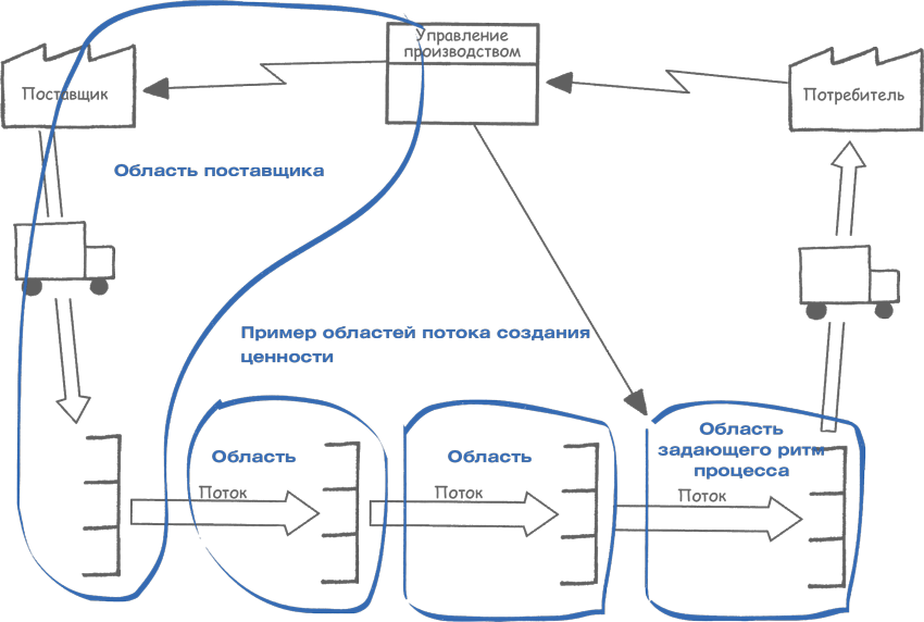 Дополнительные области: выше по потоку от области задающего ритм процесса расположены области материального и информационного потока между системами вытягивания. То есть каждый супермаркет вытягивающей системы в вашем потоке создания ценности обычно сообщается с концом другой области.