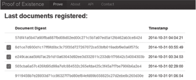 «Доказательство существования» работает следующим образом: пользователь входит на сайт службы и перетаскивает документ (или другой файл) в поле с надписью: «Щелкните здесь или перетащите документ в это поле». Копия содержимого файла не загружается на сайт, криптографическая операция вычисления хеша выполняется на клиентской стороне. Алгоритм создает дайджест, короткую криптографическую строку, представляющую данные, обработанные функцией хеширования. Два дайджеста совпадут только в том случае, если в точности совпадают данные, использованные для их вычисления. Таким образом, хеш непосредственно зависит от содержимого документа. Криптографический хеш документа помещается в транзакцию, и, когда транзакция попадет в блок, временная метка блока станет временной меткой документа. Посредством хеша содержимое документа фиксируется в распределенном журнале записей. Если функция хеширования получит тот же документ, она выдаст тот же результат, подтверждающий, что документ не изменился. Если же документ был хоть немного изменен, новый хеш не совпадет с предыдущим. Так выполняется проверка документов[122].