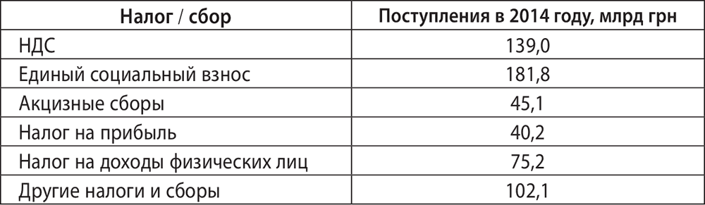 Если говорить об Украине, то основную массу налоговых поступлений (более 80 %) приносят только 5 налогов – НДС, единый социальный взнос (де-юре не входит в налоговую систему, а де-факто ничем не отличается от обычного налога, наполняет преимущественно пенсионный фонд), акцизы, налог на прибыль, налог на доходы физических лиц.