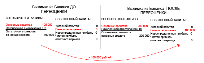 Предположим, на балансе компании имеется некий актив, стоимостью 100 000 рублей (опускаем пока накопленную амортизацию, допустим, сумма накопленной амортизации равна нулю). Оценочная компания дала заключение о его дооценки до 200 000 рублей, тогда: