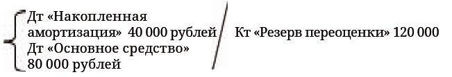 Дт «Накопленная амортизация» 40 000 рублей Кт «Резерв переоценки» 120 000