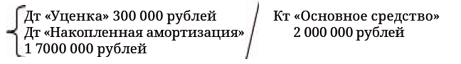 Дт «Уценка» 300 000 рублей Кт «Основное средство» Дт «Накопленная амортизация»1 7000 000 рублей 2 000 000 рублей