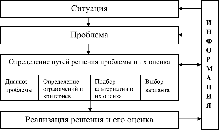 Одна из важнейших ролей, если не самая важная, – принятие управленческих решений. Решение – мыслительно-волевое действие, конституирующими признаками которого служат постановка цели и выбор пути ее достижения из нескольких альтернатив. Волевое действие предполагает предварительное осознание целей и средств действия, мысленное совершение действия, предшествующее фактическому действию, мысленное обсуждение оснований, говорящих «за» или «против» его выполнения. Этот процесс заканчивается принятием решения.