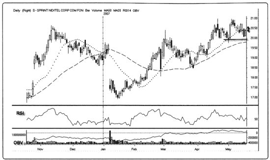 Рис. 14.1. Дневной график акций Sprint Nextel Corp. Дневной график Sprint Nextel Corp. (S) показывает, как двигались ее акции в рамках среднесрочного восходящего тренда (над 50-дневной МА) с момента их падения до самого минимального значения $16,93 в январе. С тех пор телекоммуникационный гигант вполне восстановил утраченные позиции. Вчера котировки Sprint упали ниже 20-дневной МА. Сегодня они быстро восстановились, сформировав комбинацию свечей «просвет в облаках». Если завтра они начнут расти и поднимутся выше сегодняшнего максимума в $20,43, появится хорошая возможность для свинг– и, возможно, позиционной торговли.