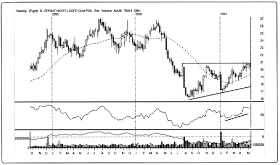 Рис. 14.2. Недельный график Sprint Nextel Corp. Акции телекоммуникационного сектора сейчас в центре внимания, б?льшая их часть растет, сохраняя при этом неплохие объемы. На данном недельном графике Sprint Nextel Corp. (S) видна фигура «двойное дно», получившаяся в результате движения котировок крупного производителя телекоммуникационной продукции и услуг в 2006–2007 гг. Уровень сопротивления в виде буквы W находится в районе $20,60. В случае если быкам удастся пробиться здесь через предложение акций, станет возможным возврат к ценам на уровне $25. 30-недельная скользящая средняя располагается под текущим графиком движения цены, а это признак бычьего рынка.