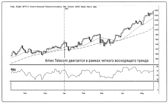Рис. 14.3. Дневной график индекса Amex Telecom (XTC). Данный дневной график показывает движение котировок индекса XTC, в общем имеющих тенденцию к повышению с начала года. Как долго это может продолжаться? Конечно, не вечно! Вот когда может пригодиться свинг-торговля. Вы быстро входите в рынок, снимаете сливки – лучшее от текущего колебания цены – а затем быстро выходите, если на рынке начнется снижение. Мы торгуем, руководствуясь тем, что видим, а не тем, что, как мы думаем, может произойти. На настоящий момент XTC в превосходной форме.