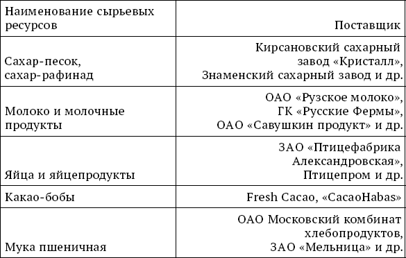 Перечень основных поставщиков и поставляемых ими сырьевых ресурсов представлен в табл. 3.