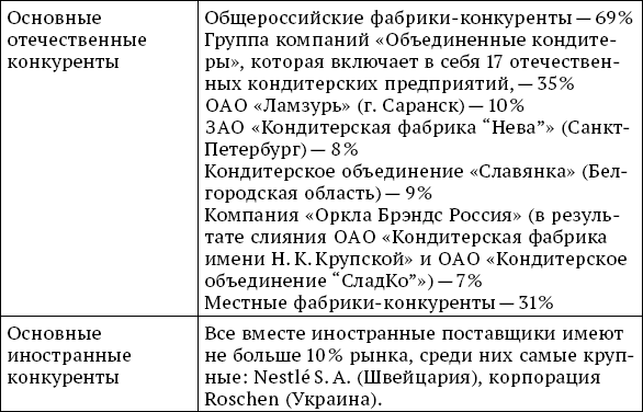 Структура отечественного рынка кондитерских изделий сегодня выглядит следующим образом: около 10 % в натуральном выражении приходится на импорт, а остальные 90 % принадлежат российским производителям, при этом на рынке действует примерно одинаковое количество крупных игроков и небольших фабрик.