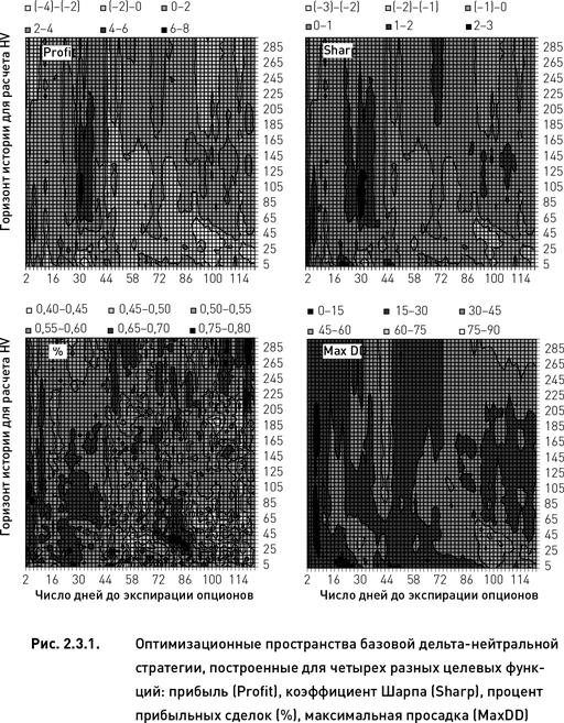 Следующая функция полезности, максимальная просадка – представляет собой общепризнанный показатель риска торговых стратегий. Оптимизационное пространство, соответствующее этой функции, показано на правом нижнем графике рис. 2.3.1. В отличие от других показателей оптимизация максимальной просадки требует нахождения минимума, а не максимума функции полезности. Поэтому оптимальными являются те области поверхности, которые имеют низкие высотные отметки. В отличие от коэффициента Шарпа оптимизационное пространство данного показателя полностью отличается от пространства, соответствующего целевой функции «прибыль». Оптимальные области располагаются в двух направлениях: (1) в первой половине диапазона значений параметра «количество дней до экспирации» при условии, что параметр «горизонт истории для расчета IV» имеет низкие значения (вдоль горизонтальной оси); (2) в широком диапазоне значений параметра «горизонт истории для расчета IV» при условии, что параметр «количество дней до экспирации» имеет низкие значения (вдоль вертикальной оси). В этих же местах были отмечены оптимальные зоны (хоть и значительно меньших размеров) для функции «коэффициента Шарпа». Это объясняется тем, что коэффициент Шарпа «содержит в себе» информацию о риске (стандартное отклонение в знаменателе формулы). Поскольку максимальная просадка является экстремальным «выбросом» доходностей, то она влияет самым непосредственным образом на стандартное отклонение и опосредовано на коэффициент Шарпа.