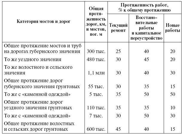 По оценкам советских экспертов, «состояние безрельсового дорожного хозяйства России к началу Октябрьской революции» было «далеко не блестящим». К 1914 г. в пределах РСФСР в границах 1927 г. было всего 18,5 тыс. км дорог с «каменной одеждой». Протяженность земских и проселочных дорог в 43 губерниях составляла свыше 1,2 млн км, из которых было улучшено всего около 99 тыс. км. При этом благоустроенные дороги сосредоточивались, главным образом, в земских губерниях Центрального района. Зато в Сибири почти не было дорог с каменным покрытием. Состояние гужевых дорог в большей части России в довоенное время характеризовалось как бездорожье[469].