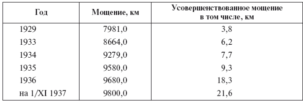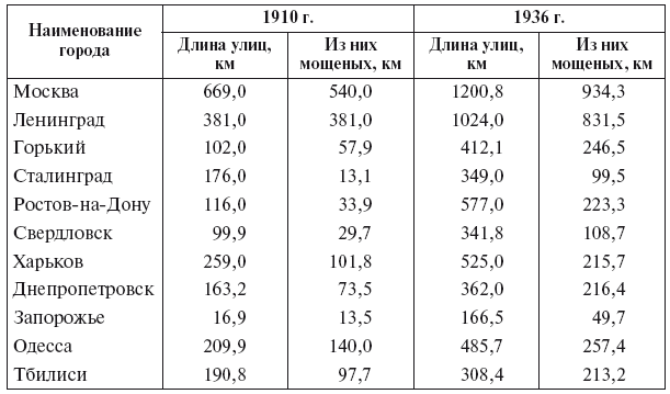 Денежные вложения в городское дорожно-мостовое строительство в СССР в первой пятилетке составили около 300 млн руб., из которых на новое строительство было направлено 200 млн, а остальное – на капремонт. В итоге было построено около 25 млн кв. м и столько же капитально отремонтировано. Только в 1932 г. было замощено около 7 млн кв. м площади, т. е. на 40 % больше, чем в 1931 г. Общая площадь замощений к концу первой пятилетки составила около 150–155 млн кв. м (или 20 % общей площади улиц и проездов), из которых усовершенствованные и высшие типы покрытий были всего на 5 млн кв. м (3,3 %). Все остальные дороги были замощены в основном булыжником, губительным для автотранспорта. По РСФСР показатели были ненамного лучше: в 1932 г. общая площадь замощения составила 102,777 млн кв. м, а доля усовершенствованных мостовых – 21 млн кв. м (свыше 20 %)[492].
