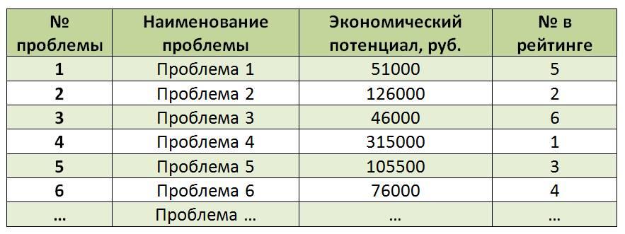 Матрица ранжирования (см. таблицу 10.15) выглядит следующим образом. В данном случае необходимо оценить каждую проблему в отдельности с точки зрения экономического потенциала. Другими словами, надо понять, какие негативные последствия порождает проблема, оценить их в рублях и представить экономический эффект от решения проблемы. Например, возвращаясь к проблеме простоя сверлильного станка, негативными следствиями могут быть простой работника или следующей операции из-за недопоставки изделия и, как следствие, работа сверхурочно или в выходной день, скопившиеся непереработанные запасы перед операцией и т. п. Все эти потери можно перевести в денежный эквивалент: заработная плата работников, замороженные средства в производстве, электроэнергия, стоящая дороже в выходной день, издержки, которые понесет Заказчик из-за недопоставки (если до этого дошло дело). Чтобы грамотно перевести проблемы в денежный эквивалент, потребуется помощь финансовой службы. Необходимо учитывать все потери, даже несколько сэкономленных секунд в час могут сложиться в одну сэкономленную смену в месяц. Рассчитывая значения потерь в денежном или натуральном эквиваленте, лучше пересчитывать в годовой масштаб, тогда потери начинают просматриваться гораздо реальней, и игнорировать их становится гораздо сложнее.