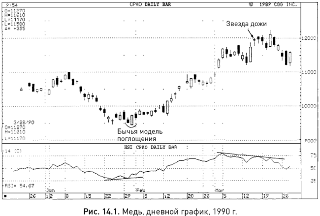 На рисунке 14.1 можно видеть как бычью положительную дивергенцию RSI, так и медвежью отрицательную в сочетании со свечными сигналами. Когда 24 января рынок обновил минимум, значение RSI составляло 28 %. Затем 31 января цены упали еще ниже, однако RSI достиг 39 %, т. е. находился на существенно более высокой отметке, чем 24 января. Другими словами, наблюдалась бычья положительная дивергенция, в дополнение к которой 31 января на ценовом графике появилась белая свеча, поглотившая предшествующую черную, и таким образом возникла бычья модель поглощения.