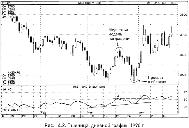 На рисунке 14.2 падение, начавшееся с медвежьей модели поглощения, прекратилось с формированием просвета в облаках, что сопровождалось положительной дивергенцией RSI. Некоторые аналитики наносят линии тренда непосредственно на график этого индикатора, и в данном случае линия поддержки восходящего тренда RSI устояла, хотя на основном графике – ценовом – 29 марта были зафиксированы новые минимумы.