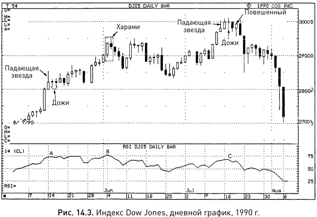 Образование дожи в период восходящего тренда – тревожный симптом, однако, как другие технические индикаторы, иногда свечи этого типа наводят на ложный след. Одним из способов избежать этого служит применение других технических инструментов для проверки сигналов дожи. Так, на рисунке 14.3 эту функцию выполняет RSI. В середине мая на графике индекса Dow Jones появились падающая звезда и две дожи (на графике RSI эта зона помечена буквой А), что предвещало завершение предыдущего восходящего тренда, по крайней мере, на время. Несколько следующих недель рынок держался в горизонтальном коридоре, а затем достиг новых максимумов в области В, после того как индекс поднялся на 100 пунктов по сравнению со значениями в области А. Однако RSI при этом находился на одинаковых отметках. Такое сочетание отражало истощение внутренней силы рынка, и дополнительно области В появился еще один медвежий сигнал в виде модели «харами».