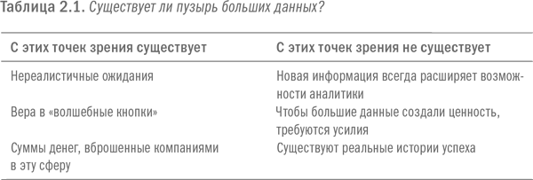 На фоне сегодняшнего ажиотажа вокруг больших данных часто возникает вопрос о том, а не превращаются ли большие данные в очередной пузырь?{12} В январе 2013 г. исследовательская компания Gartner высказала официальное мнение, что большие данные прошли пик цикла ажиотажа и вступили в этап избавления от иллюзий{13}. После публикации этой статьи мне позвонил журналист и спросил, что я думаю по поводу заката больших данных и пузыря, который вот-вот лопнет. Мой ответ сначала может показаться противоречивым, но после моего объяснения вы поймете, в чем дело. Я ответил, что в некоторых отношениях угроза пузыря больших данных действительно существует. Но с других более важных, точек зрения, такого пузыря нет. Мой ответ кратко изложен в тексте и в таблице 2.1.