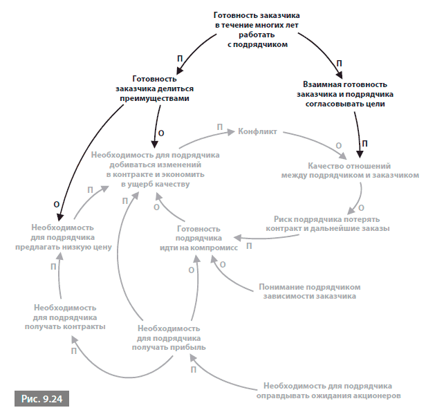 На рис. 9.23 и 9.24 показано, как одна и та же политика взаимной готовности заказчика и подрядчика согласовывать свои цели и готовности заказчика делиться преимуществами оказывается выгодной для обеих сторон.