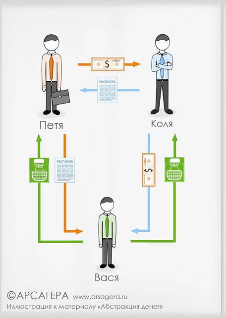 может купить у Васи товаров на 100 рублей, расплатившись распиской Коли, если Вася, так же как и Петя, доверяет Коле и считает, что тот сможет вернуть 100 рублей. Получается, мнение Пети и Васи о том, что Коля может вернуть долг, позволило Васе продать товаров на 200 рублей, при том что денег в наличии имелось только 100 рублей.