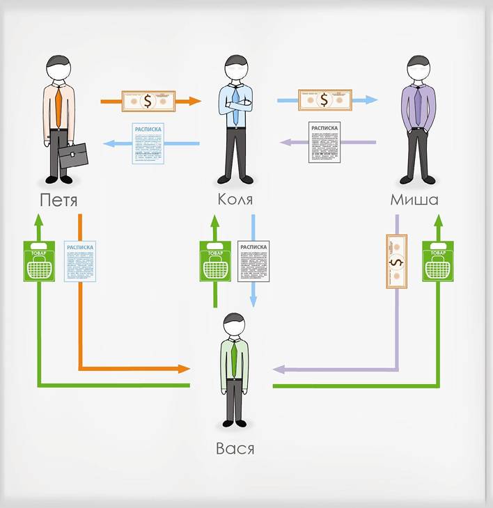 Начнем с бытовой ситуации: у Пети есть 100 рублей, и он дает их в долг Коле под расписку. Коля может купить у Васи товаров на 100 рублей. Петя тоже