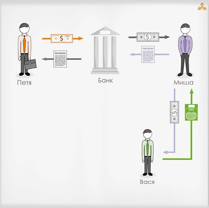 В примере мы можем заменить Колю на Банк. Получится, что Петя отдал 100 рублей в Банк, а Банк выдал кредит Мише. Но в случае с банками действует правило частичного резервирования, поэтому Банк может выдать Мише меньше 100 рублей.