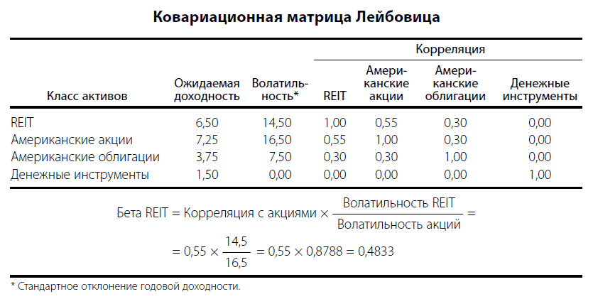 Это, конечно, предельно упрощенное представление о ковариационной матрице Лейбовица и его подходе к расчету подразумеваемой беты новых классов активов. Скажем только, что в своем примере он объединил REIT с традиционными классами активов – американскими акциями и облигациями. Обратите внимание на то, что Лейбовиц принимает ожидаемую премию за риск по американским акциям равной 5,75 %, или величине ожидаемой доходности этих акций (7,25 %) минус доходность денежных инструментов (1,5 %). Также предполагается, что бета американских акций равна 1,00.