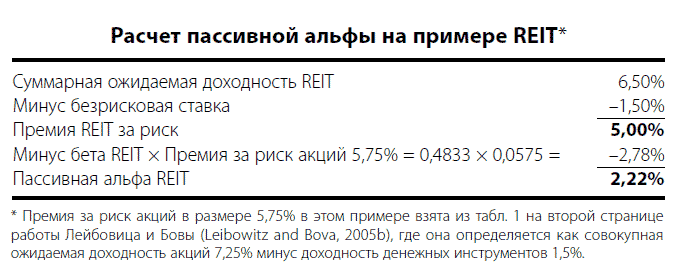 Лейбовиц определяет пассивную альфу в полном соответствии с духом CAPM. Он опять берет в качестве примера REIT, и показывает преобразования, необходимые для расчета пассивной альфы при определенных допущениях. В приведенной ниже таблице эти допущения изложены в текстовой форме, а результаты расчетов выделены жирным шрифтом.
