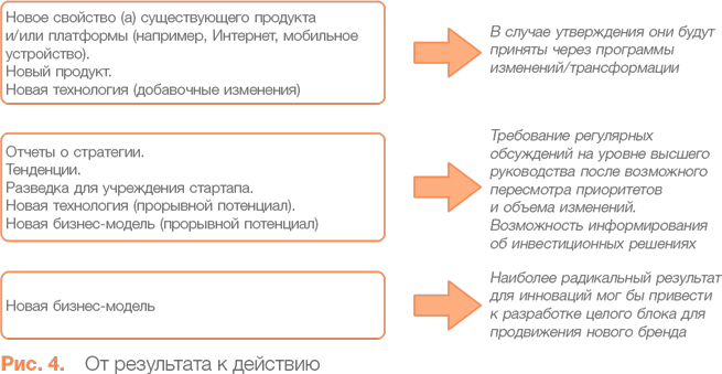 Я совершенно убежден, что это необходимо сделать. В большинстве случаев, в зависимости от результата, клиенты, аудиторы и механизмы продвижения и дистрибуции инноваций могут быть определены заранее. На рис. 4 показаны некоторые примеры того, как результаты работы инновационной лаборатории должны обрабатываться, чтобы стать настоящим действием.