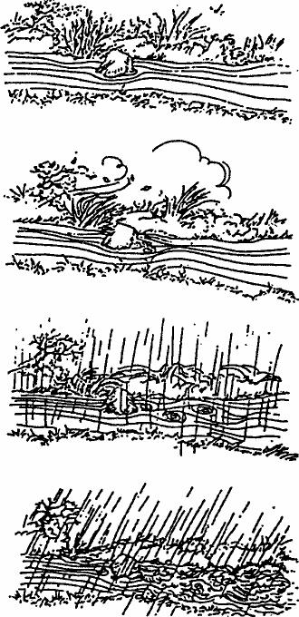 Рисунок 2.1 показывает преобразование линейного потока в нелинейный, или турбулентный поток. На Рисунке 2.1а ручей течет очень стабильно и совершенно предсказуем. Рисунок 2.lb показывает больше бегущей воды; а выше камня начинает образовываться турбулентность. Добавим еще воды (энергия в форме дождя или гравитации), и турбулентность увеличивается, а поток становится менее предсказуемым (Рисунок 2.1с и Рисунок 2.1d).