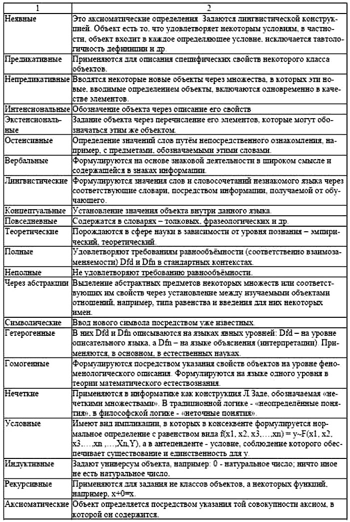 На макроуровне, в зависимости от предметной области, способа формирования и других признаков существует несколько разновидностей определений. С учётом содержания источников и с позиций задач КУИОТ дадим краткую характеристику некоторых видов определений (таблица 3.1).