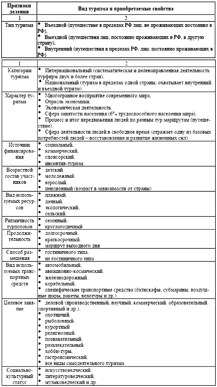 На основании полученных в результате вышеприведённой классификации свойств, а также признаков вышеуказанного определения туризма, выделим существенные признаки туризма: