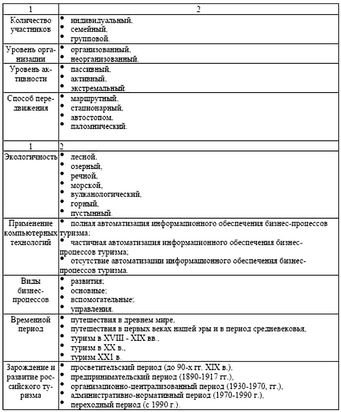 В данной классификации применён достаточно широкий состав признаков деления и выделен соответствующий объём свойств. Поясним здесь некоторые из них. Так, например, по уровню автоматизации выделено три группы туризма. Следует отметить, что в настоящее время не существует турфирмы, тем более сферы туризма, абсолютно полностью автоматизированной относительно информационного обеспечения бизнес-процессов. Абсолют автоматизации не может быть в принципе в силу относительности таких категорий как-то время и пространство. Всегда будут возникать новые задачи туризма, которые во времени могут выполняться вручную, пока не будет разработан проект автоматизации и его внедрение. Относительно категории пространства следует отметить то, что в сфере туризма всегда могут существовать процедуры, которые выполняются вручную, например, регистрация информации, её отдельные операции, например, нажатие клавиши для автоматического сканирования регистрируемого объекта или информации о нём.