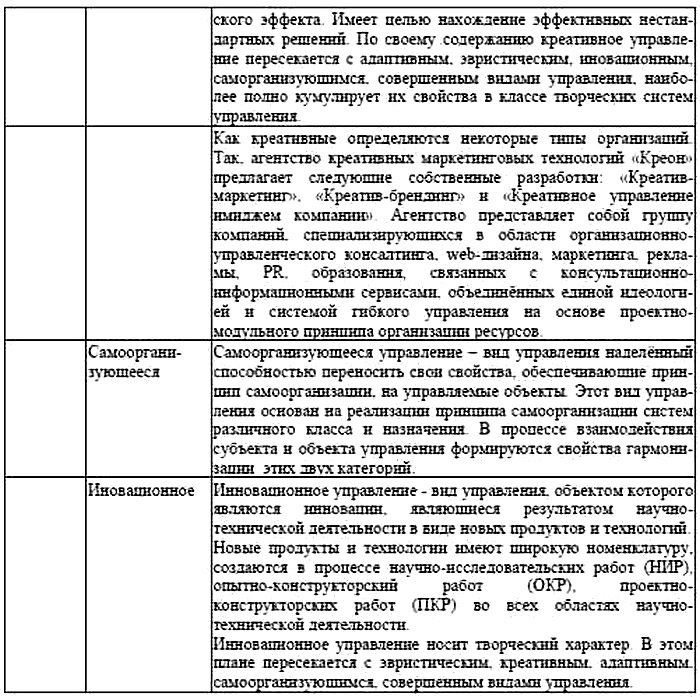 Наиболее эффективным и перспективным видом управления ИОБПТ представляются творческие системы управления. Далее в работе проводится рассмотрение в той или иной мере наиболее значимых из них. Здесь же отметим адаптивное управление, которое определяется свойством адаптивности. Адаптивность структуры управления определяется её способностью эффективно выполнять заданные функции в определённом диапазоне изменяющихся условий. Чем относительно шире этот диапазон, тем более адаптивной считается структура.