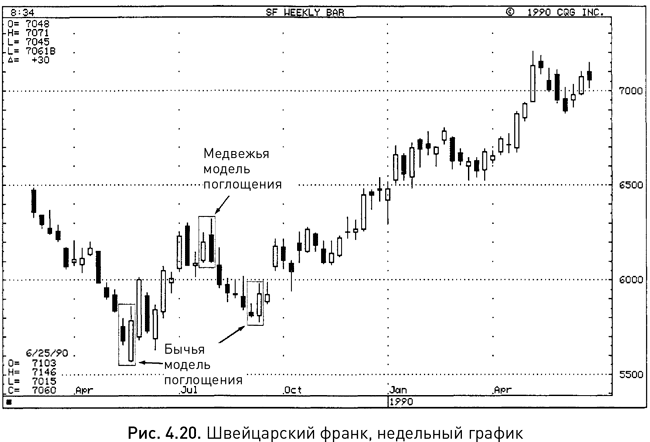 На рисунке 4.20 можно увидеть, как две идущие подряд свечи (за недели, начавшиеся 15 мая и 22 мая) образовали бычью модель поглощения, а затем в последние недели июля возникла медвежья модель. Наконец, еще одна модель поглощения, на сей раз бычья, образовалась в сентябре и послужила отправной точкой для длительного ралли.