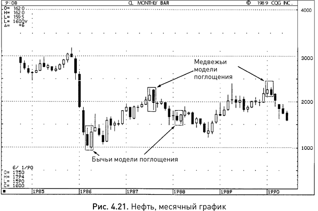 На графике нефти, который приведен на рисунке 4.21, отчетливо видны бычьи и медвежьи модели поглощения. В конце 1985 г. произошло резкое 20-долларовое падение цены, после чего в марте и апреле 1986 г. две свечи образовали бычью модель поглощения. Стартовавшее с нее ралли продолжалось до возникновения медвежьей модели поглощения в середине 1987 г., а затем сменилось нисходящей тенденцией, которая, в свою очередь, завершилась небольшой бычьей моделью поглощения в начале 1988 г. Затем в течение пяти месяцев наблюдалось боковое движение цены.