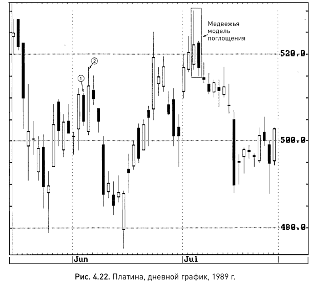 В западном техническом анализе ближайшим аналогом модели поглощения является день разворота (reversal day). Это день, когда во время восходящей (или нисходящей) тенденции достигается новый ценовой максимум (минимум), однако завершаются торги на отметке ниже (выше), чем цена закрытия предыдущего дня. Впрочем, модель поглощения позволяет даже тогда получать сигналы о грядущей смене тренда, когда о наступлении дня разворота говорить не приходится. Это будет видно, например, по рисункам 4.21, 4.22 и 4.23.