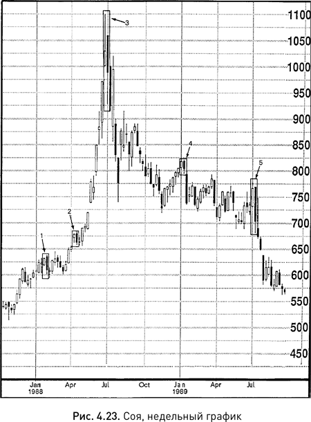 Рисунок 4.23 содержит серию медвежьих моделей поглощения, первая из которых прервала восходящий тренд и направила рынок в боковой коридор на несколько месяцев, а вторая – лишь ненадолго прервала наблюдавшееся в то время ралли. Медвежьи модели поглощения 3, 4 и 5 дали сигналы о развороте тренда, которые невозможно было уловить альтернативным способом: во всех этих случаях вторая свеча модели не достигала ценового максимума, поэтому не могла считаться неделей разворота.