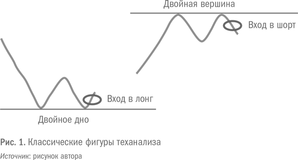 Возьмем, к примеру, фигуры «двойное дно» и «двойная вершина» – их классический вид представлен на рис. 1. Идея этой простой модели в том, что при повторном заходе цены на предыдущий экстремум – максимум или минимум – мы можем поймать движение вниз или вверх, соответственно. Считается, что если цена удержалась на уровне предыдущего экстремума, то велика вероятность отскока от него. Многие трейдеры взяли в свой арсенал данную систему. Тем более, что эти фигуры можно наблюдать на рынке по нескольку раз на дню. Но необходимо учитывать, на каком рынке вы торгуете и чем.