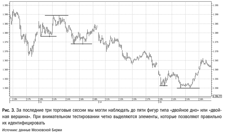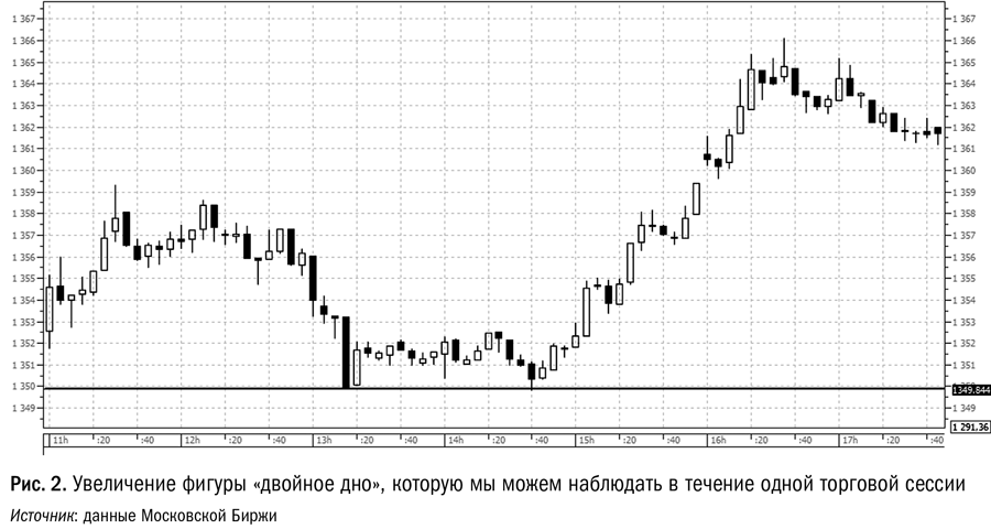 Итак, чтобы убедиться в применимости «двойного дна» и «двойной вершины» к вашему инструменту, нужно открыть график цены соответствующей бумаги и глазами отыскать эти фигуры. Желательно видеть историю как минимум за 3–6 месяцев. В этом случае мы сможем провести более точный анализ. Но прежде убедитесь, что точно знаете, как именно строятся данные фигуры. Если не уверены, то советую открыть любую книгу по техническому анализу и еще раз перечитать. От этого зависит качество проведенного анализа, и, как следствие, ваш будущий доход. Кстати, на рис. 2 вы можете увидеть, как выглядит «двойное дно» в рамках одной торговой сессии.