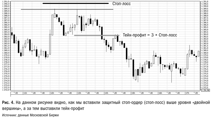 Именно так (мы должны заранее определить, при каких условиях – благоприятных или нет) мы закрываем позицию. Например, при покупке актива за $100 мы планируем продать его за $110. В данном случае мы выставляем тейк-профит по цене $110. Если он сработает, то мы заработаем $10, которые и планировали «снять» с этой сделки. Есть несколько подходов к определению размера тейк-профита. Одни закрывают прибыльную позицию, сдвигая этот уровень в зависимости от ценовой динамики. Другие предпочитают статичный тейк-профит. Например, у меня есть ряд стратегий, где я устанавливаю фиксированное значение ожидаемой от сделки прибыли. В вашем случае я бы сделал так же. Причем величину тейк-профита следует увязывать с другим важным параметром торговой модели – стоп-лоссом. Это отложенная заявка на закрытие убыточной позиции. Устанавливая стоп-лосс, вы ограничиваете потери. В качестве эксперимента задайте тейк-профит на уровне, отстоящем от текущей цены втрое дальше, чем стоп-лосс. Сам же стоп-лосс поставьте в паре пунктов за экстремумом. Пример для фигуры «двойная вершина» приведен на рис. 4, здесь открывается короткая позиция.