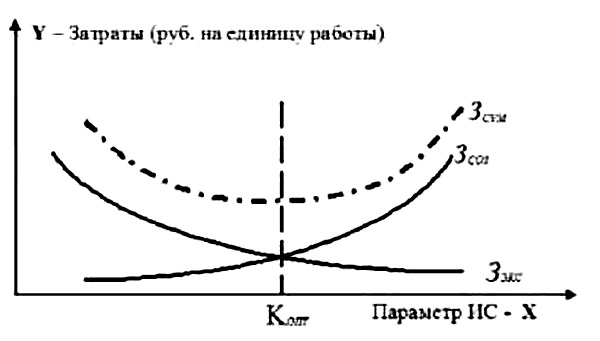 Обозначения: Зэкс – эксплуатационные затраты на весь период эксплуатации ИС; Зсоз – затраты на создание ИС (НИР, проектирование и построение); Зсум – суммарные затраты на жизненный цикл ИС; Копт – критерий оптимальности.