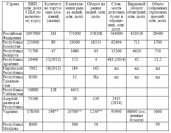 Источник: IMF World Economic Outlook Database. October 2014 (ВВП); International Financial Statistics Yearbook 2014 (валютные курсы для пересчета в доллары); Swiss RE Sigma № 3 2014 (страховые премии); World Federation of Exchanges Database (биржевая статистика по России и Казахстану); FEAS Yearbook 2013/2014 (данные биржевой статистики по Армении, Киргизии, Молдове, Узбекистану и Азербайджану; World Development Indicators, World Bank (количество листинговых компаний и капитализация Украины, Армении и Киргизии); Данные национальных регуляторов (БР, НБРК, НБРБ); CBONDS