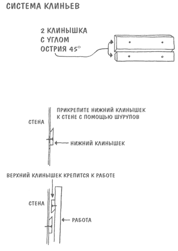 Вам понадобятся два клинышка с углом острия 45 градусов. Один из них прикрепите к стене, второй – к обратной стороне первого. Работу надо поместить на тот клинышек, который прикреплен к стене.