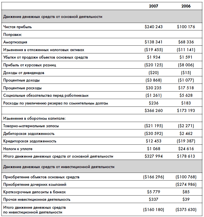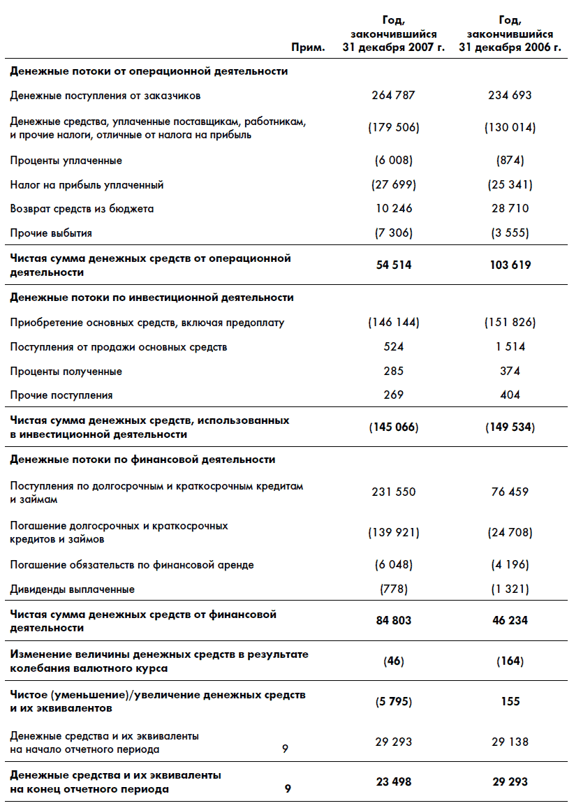 А вот отчет по косвенному методу, представленный крупнейшим производителем коксующегося угля в России – шахтой «Распадская» (отчетность по МСФО за 2007 г.; $ тыс.):
