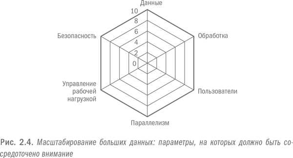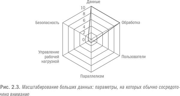 Главное внимание при работе с большими данными обычно уделяется проблеме масштабирования. Если конкретнее, то количеству данных и объему требуемой обработки. Между тем нужно учитывать и другие параметры масштабирования в том случае, если организация решает внедрить аналитику на уровне всего предприятия и особенно если решает превратить ее в операционную. Эти аспекты проиллюстрированы на рис. 2.3 и 2.4.