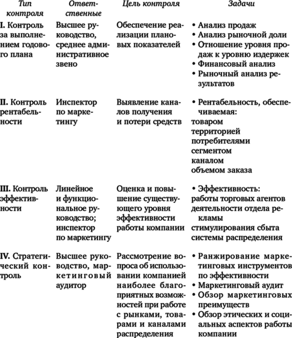 Контроль – это способ выявления ошибок в реализации стратегии или в самой стратегии. Компания могла плохо провести какие-то мероприятия, неудачно подобрать инструментарий маркетинга, неправильно определить целевой рынок, провалить исследовательский этап. Контроль – не один вид деятельности, а обширный набор механизмов, позволяющих убедиться, что компания находится на верном пути. Для маркетинга выделяется четыре типа контроля[20], которые перечислены в таблице.