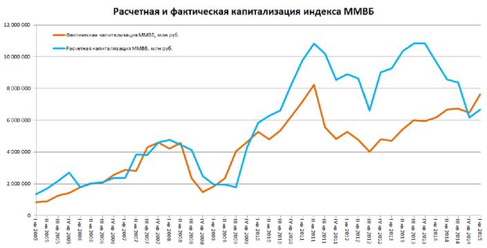 График с фактической капитализацией индекса ММВБ отличается от графика со значением индекса. Связано это с тем, что база расчета индекса периодически изменяется, с 12 эмитентов в 2004 году она была расширена до 45 эмитентов в 2015 году, поэтому капитализация индекса выросла значительнее, чем сам индекс. Кроме того, при расчете индекса ММВБ применяется так называемый весовой коэффициент, ограничивающий максимальную долю эмитента в индексе. Увеличение данного коэффициента ведет к увеличению капитализации индекса, тогда как роста цен на акции может и не наблюдаться.
