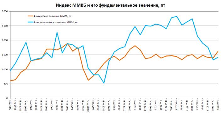Исходя из значений индекса Арсагеры и ММВБ, рассчитывается фундаментальное значение индекса ММВБ, которое представлено на графике «Индекс ММВБ и его фундаментальное значение».